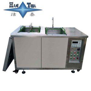 潔泰龍門臂超聲波清洗機,是一款全自動,清洗過程由微控控制,5個由SUS316材質(zhì)制作的清洗槽,漂洗槽、烘干槽組成的一條連續(xù)工作的裝置。操作者將裝有工件的清洗籃放置在進料輸送滾道上,輸送滾道將清洗籃送往上料工位,機械手依次將清洗籃送往各清洗槽,對工件進展熱浸洗、超聲粗洗、超聲精洗、蒸汽浴洗及熱風烘干,第一到五槽的熱浸洗、超聲波粗洗、超聲波精洗、蒸汽浴洗、熱風烘干過程中,清洗籃旋轉(zhuǎn)機構(gòu)使清洗藍始終處于旋轉(zhuǎn)狀態(tài),使工件充分得到清洗,提升過程中洗籃也始終處于旋轉(zhuǎn)狀態(tài),并在冷凍區(qū)停留一段時間,使清洗液脫離工件流回清洗槽,工件橫移機構(gòu)負責將工件挪動一個工位,出料輸送滾道將清洗好的工件送往出口,操作者在出口處將工件卸下,翻開洗籃將工件道入器皿,清洗既告完成。